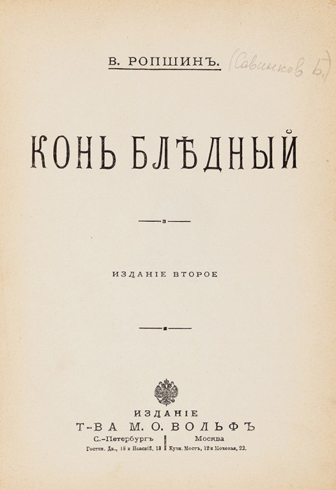 «Конь бледный» — отдающее нарциссизмом произведение одного из лидеров революционного терроризма, выпущенное через несколько лет после описываемых событий. Сенсация в 1909 году была грандиозная. Под псевдонимом В. Ропшин в литературном журнале «Русская мысль» печатался Борис Савинков, возглавлявший Боевую организацию эсеров. Сочинение Савинкова-Ропшина вызвало скандал. Как сторонники, так и противники революции ополчились на автора за содержание, но отмечали его литературный талант.