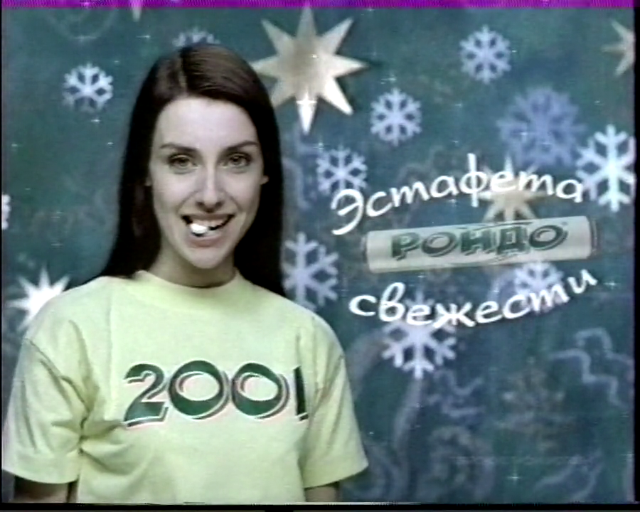 Вернёмся на РТР. 17 декабря 2000 года мятные леденцы «Рондо» приглашают на «эстафету свежести». Парень, загадочно улыбаясь на фоне снежинок, кладёт в рот освежающий кругляшок. К нему подходит девушка. Они целуются. Девушка открывает рот и показывает, что конфетка-то уже у неё. Вот так новогодний фокус-покус!
