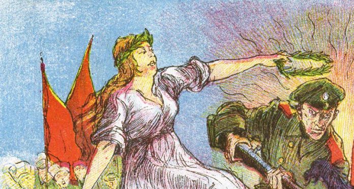 Женские образы были частым явлением на открытках и плакатах 1917 года.Даже в военной пропаганде Первой мировой Россия воспринималась как женщина — и надо отметить, далеко не патриархального типа.…И даже Интернационал, несмотря на мужской род этого слова.
