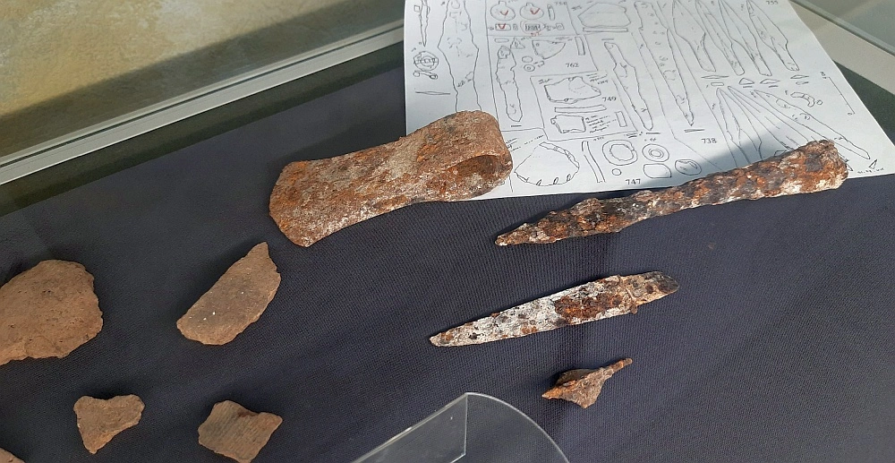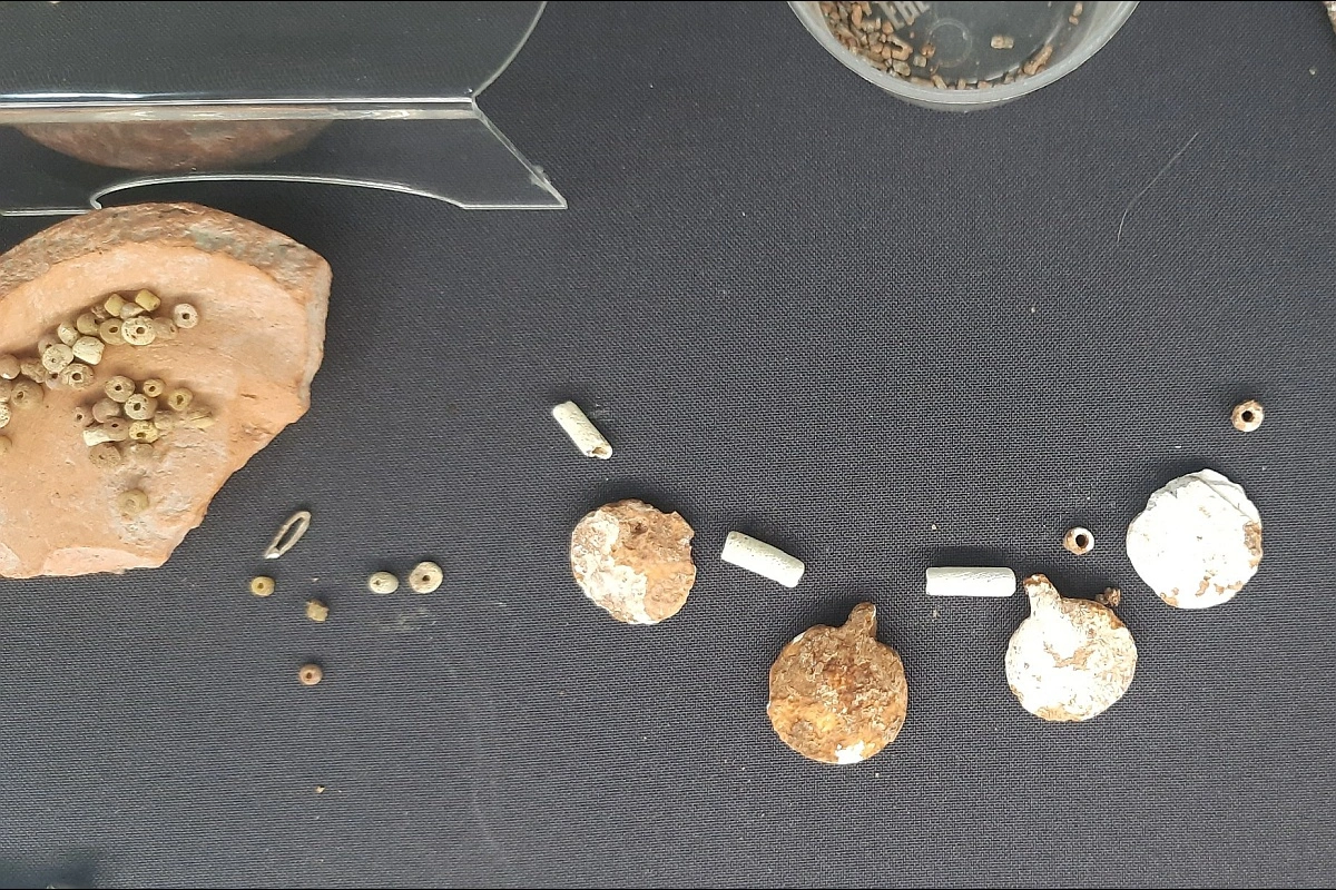 Пер­вый ком­плекс при­над­ле­жит вои­ну-всад­ни­ку и вклю­ча­ет пол­ный набор ору­жия, дета­ли кон­ской упря­жи и эле­мен­ты пояс­ной гар­ни­ту­ры, сви­де­тель­ству­ю­щие о высо­ком ста­ту­се их вла­дель­ца. В жен­ском ком­плек­се архео­ло­ги обна­ру­жи­ли кол­лек­цию укра­ше­ний. Сре­ди них — изящ­ные височ­ные под­вес­ки из рако­ви­ны Turbo marmoratus, добы­ва­е­мой в Индий­ском оке­ане, бусы из стек­ла, брас­ле­ты, кото­рые рас­кры­ва­ют сек­ре­ты мастер­ства древ­них юве­ли­ров и обшир­ные тор­го­вые свя­зи реги­о­на, укра­ше­ния из оло­ва, пряж­ка, буси­ны с узо­ром. Еще одна необыч­ная наход­ка — остат­ки голов­но­го жен­ско­го убо­ра, обши­то­го бисером.