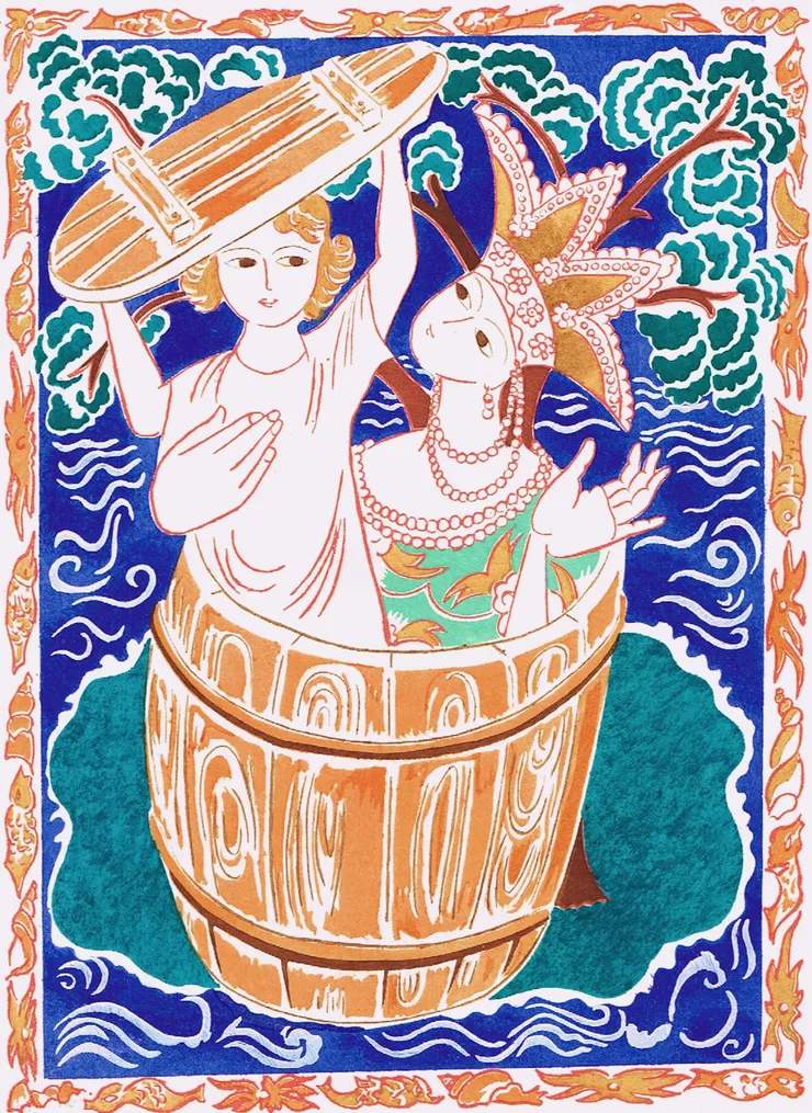 «Из «Сказ­ки о царе Сал­тане, о сыне его слав­ном и могу­чем бога­ты­ре кня­зе Гви­доне Сал­та­но­ви­че и о пре­крас­ной царевне Лебе­ди»». Худож­ник Ната­лья Гон­ча­ро­ва. 1921 год