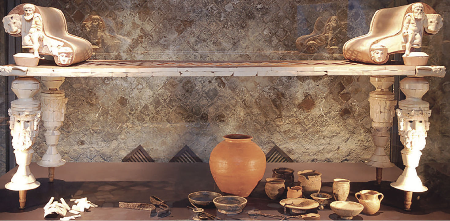 Виктор Вахонеев в своей статье «Погребальные ложа в кремациях Херсонеса Таврического» реконструировал комплекс подобного погребального церемониала. Среди проанализированных артефактов с раскопок — бронзовые детали, гвозди, декоративные накладки из кости, сосуды, бусины из фаянса и стекла, фрагменты золотой фольги.