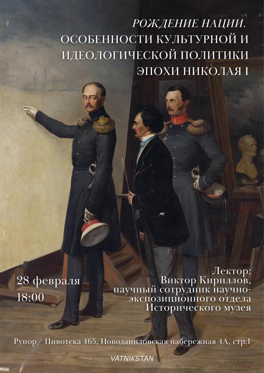28 февраля в пространстве «Пивотеки 465» на Новоданиловской состоится лекция Виктора Кириллова «Рождение нации. Особенности культурной и идеологической политики эпохи Николая I». Слушатели подробнее узнают о скрытых целях и задачах «теории официальной народности» и политике эпохи Николая I.